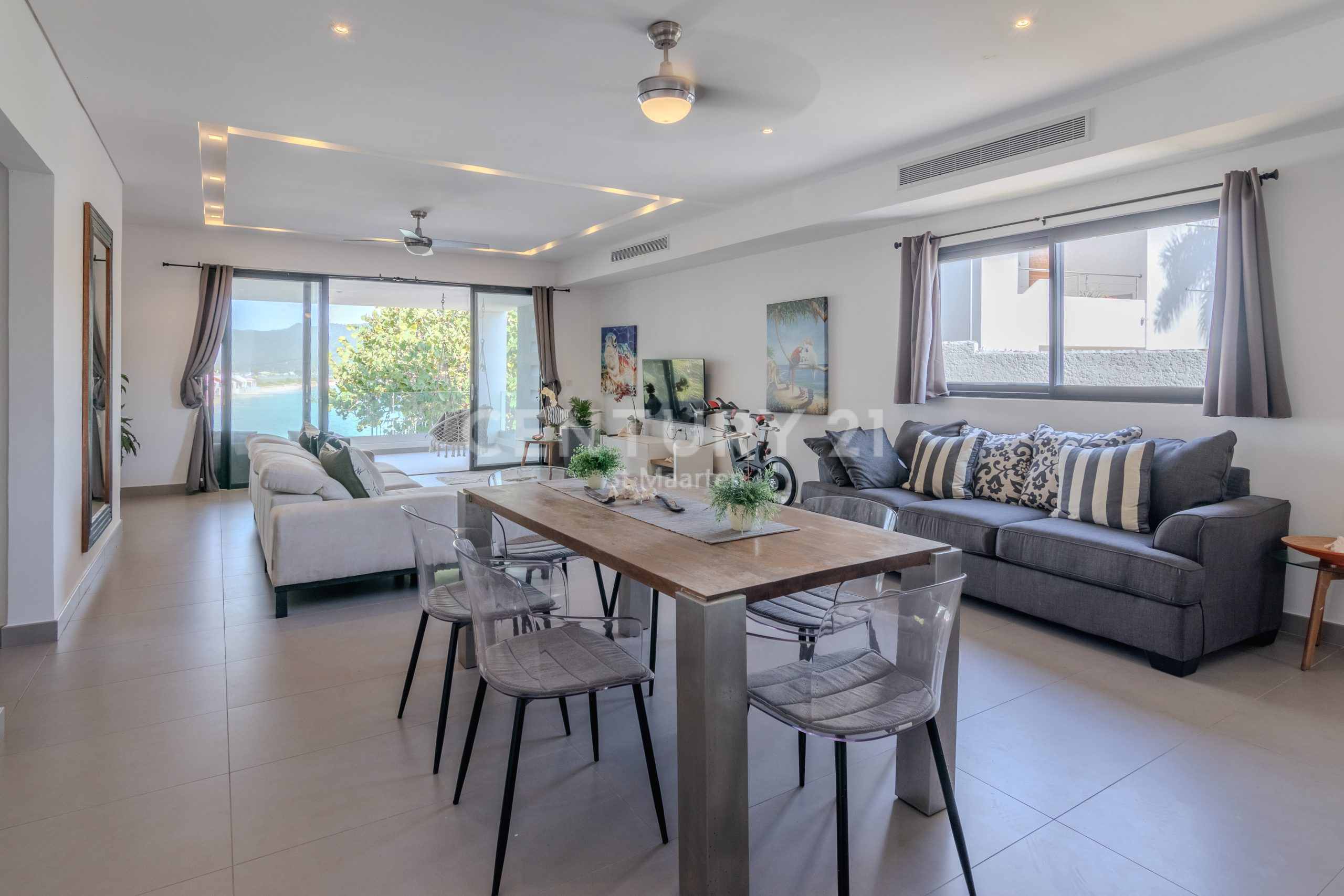 This oceanfront condo, built on a single level, offers beautiful beach and ocean views; while being only a 2 minute walk to the white sands of Simpson Bay beach. Over 150 square meters of interior size with two generous-sized bedrooms and an awe-inspiring living space designed for light and space. A covered terrace and tropical views offer an outside space that you will cherish with family and friends.