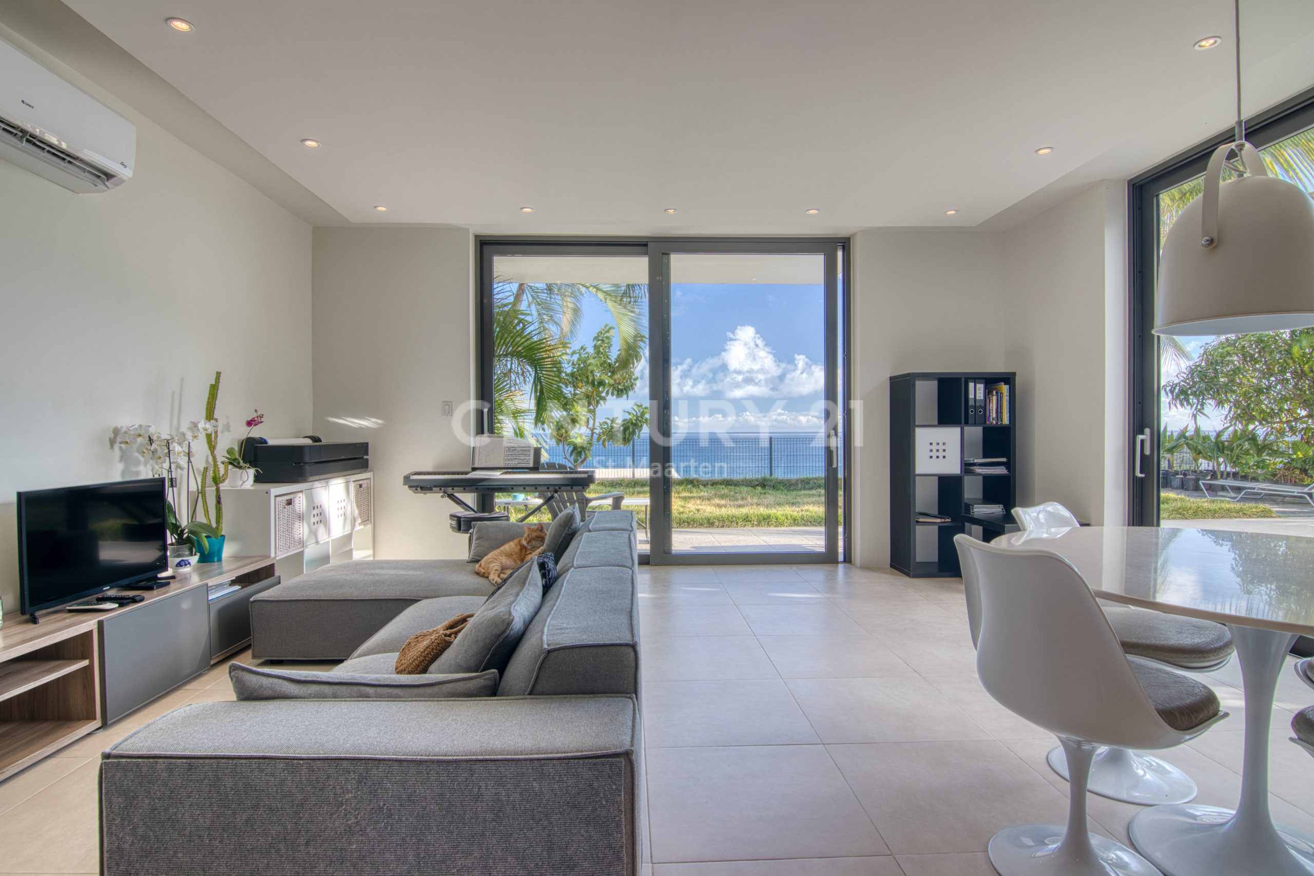 The open-concept living and dining area is illuminated by natural light and cooled by gentle breezes, creating an inviting ambiance.