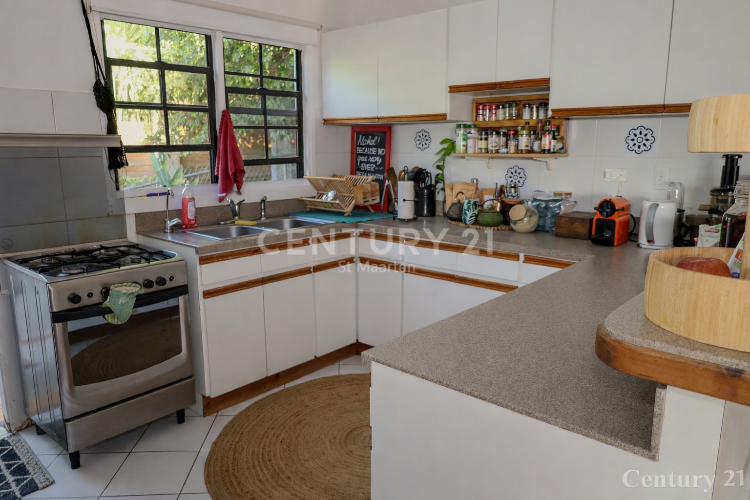 Large windows allow natural light to fill the interior while offering beautiful views of the Caribbean Sea.